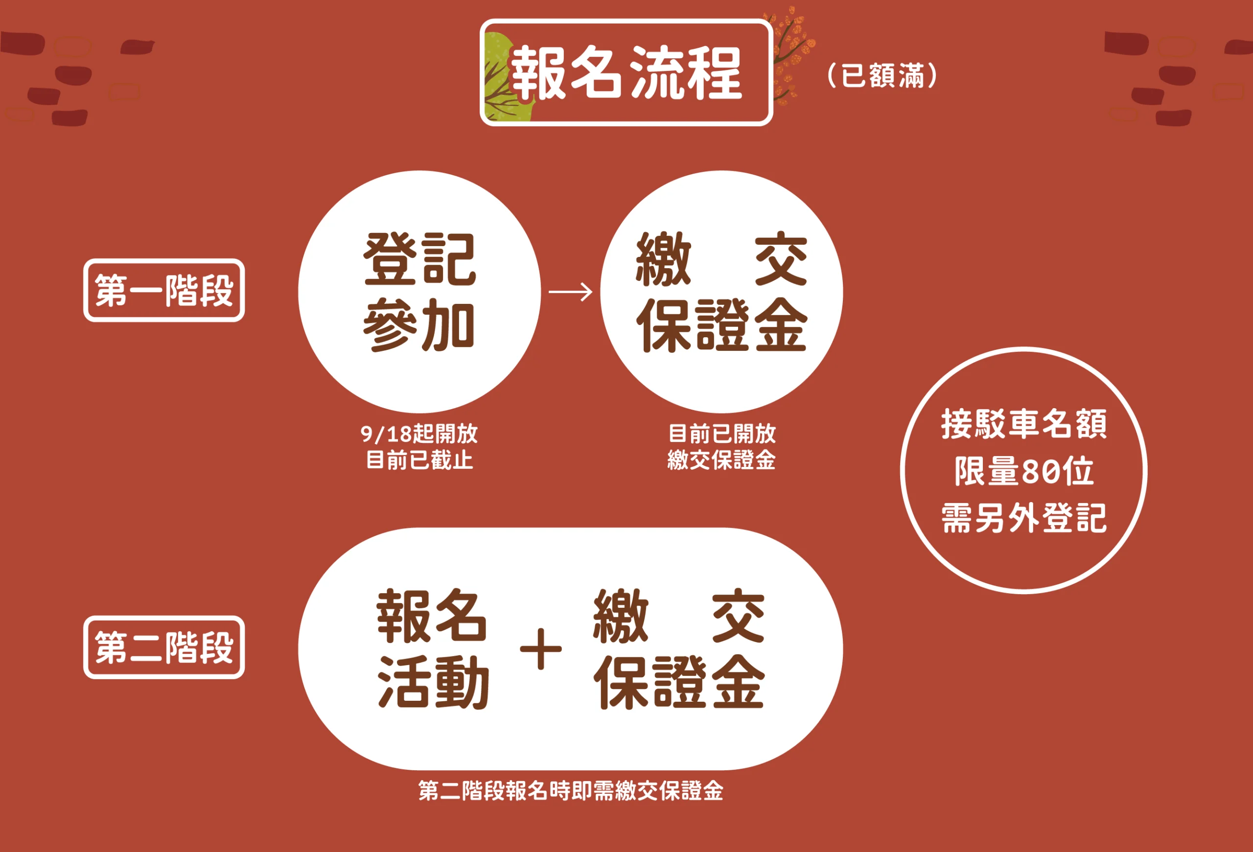 - 第二階段報名可直接繳交保證金,第一階段登記另有繳費訂單,請前往查報名/訂單繳費。保證金開放繳交到11/5(二)止。